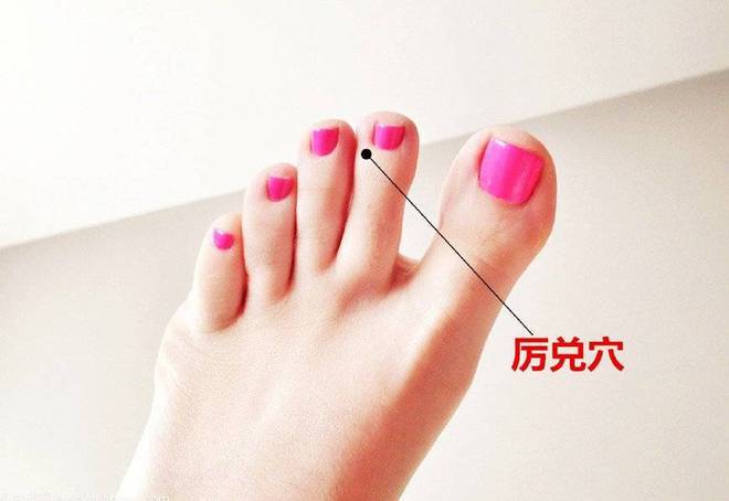 厲兌穴位於足底中央的前第三和第四蹠骨骨間凹陷處。按壓厲兌穴可以調節人體的腎陽氣,增強腎臟的功能。
