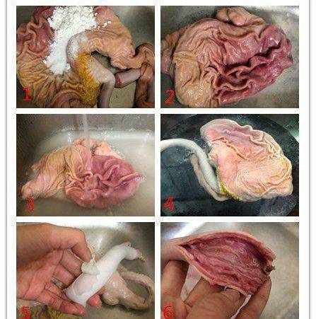 1.買回來的豬肚先清洗掉一些肥油,翻過來用水沖洗掉一些你粘液,2.再用鹽,生粉搓洗,先不要加水,直接加進去搓洗,搓洗到沒有黃色的粘液3.用水沖洗幹凈4.鍋裡坐水燒開後再把豬肚放進去燙煮至豬肚腸子變成白色即可撈出,切記不可煮太久5.把腸子上的白色膜去掉用刀子刮幹凈6.再把腸子剪開,腸子最好是剪開,因為會有沙子,這樣清洗起來會更容易,洗幹凈備用