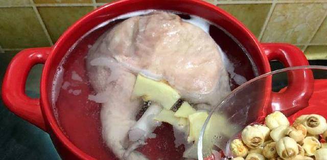 8.豬肚冷水下鍋加入薑片,加入泡發好的蓮子