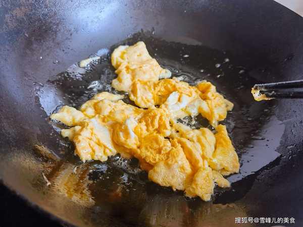 第三步:鍋裡放入花生油燒熱,倒入蛋液炒成雞蛋塊。