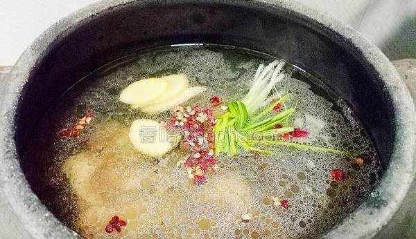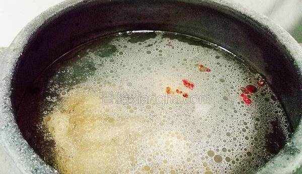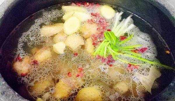 7.此時將蔥,薑,花椒放入砂鍋中,開火燒湯。