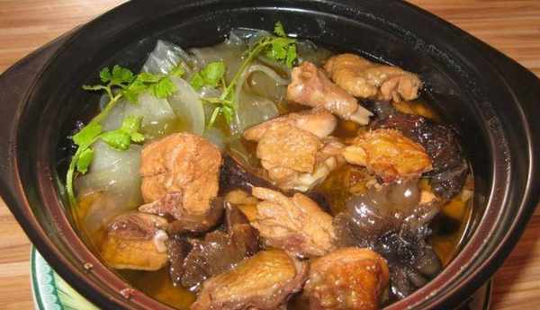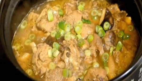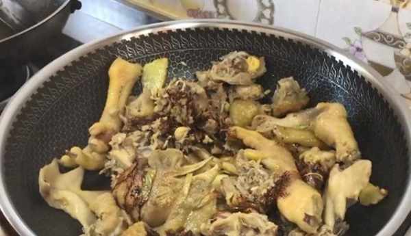 第五步:再將雞肉連湯帶肉,一起倒入砂鍋中,下入香菇,轉小火燉煮40分鐘,然後再加入浸泡好的粉條燉煮5分鐘,加入十三香和胡椒粉調味,最後撒上蔥花即可出鍋上桌。