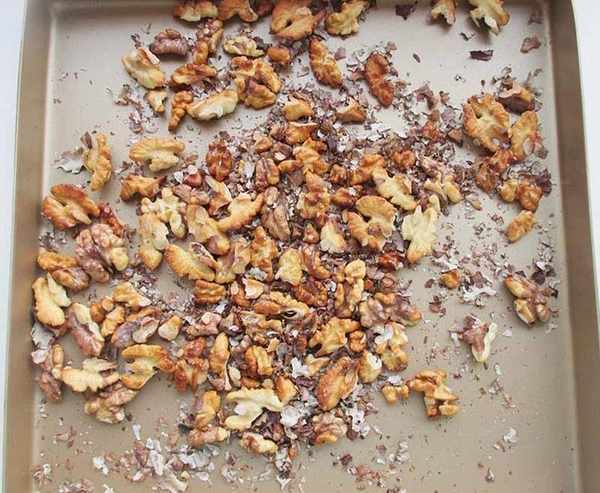 1核桃去殼後放在烤箱200度,烤6-8分鐘,烤至微黃取出去皮備用。