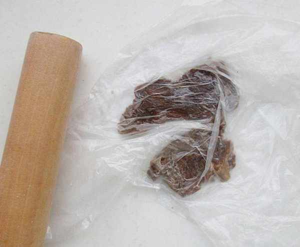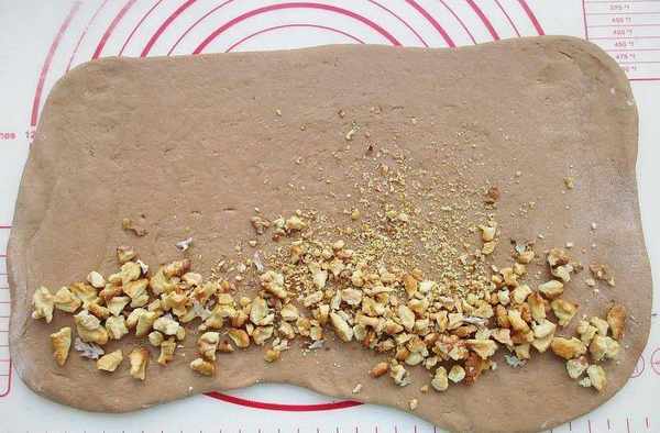 9把光滑的面團搟薄搟開,搟成一個長方形的面片,在一側均勻撒上核桃碎。