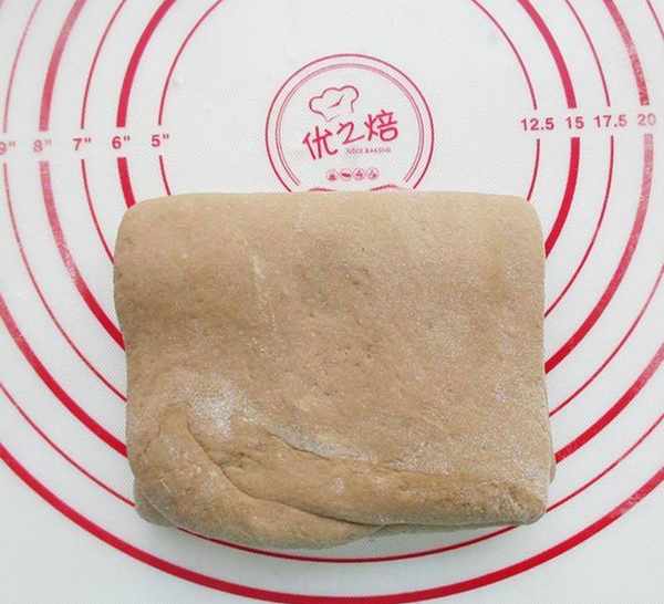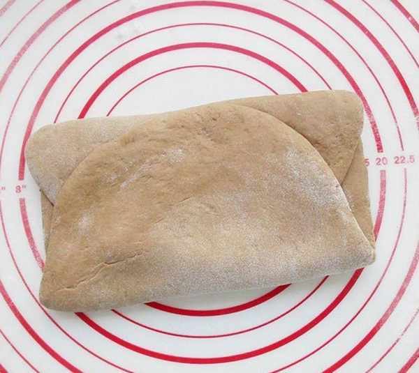 7將發好的面團取出,重新揉勻排氣。灑少許幹面粉防粘,然後用搟面杖把面團搟長,將上部分和下部分都往中間折。