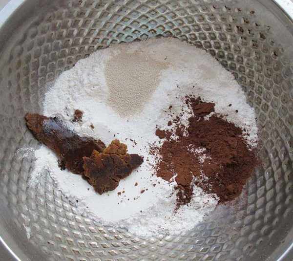 3將面粉,可可粉,古方紅糖,酵母粉放在盆中。