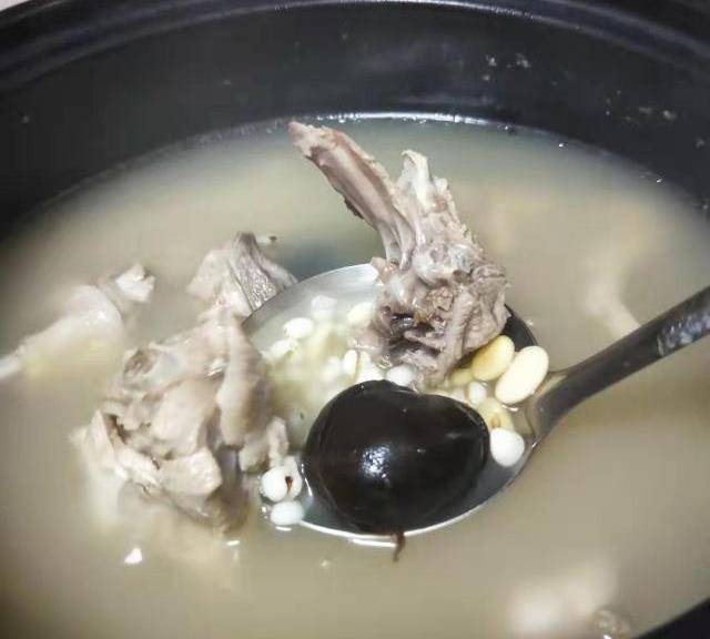 2.準備好一口砂鍋,將生薑片鋪於鍋底,倒入薏米,眉豆,然後將鴨肉塊擺好,倒入清水,淹沒鴨肉至鍋沿,大火燒開後轉文火燉兩小時。在一小時45分鐘後開蓋,放入咸梅,增加酸性開胃,然後蓋上再煮15分鐘就可以開鍋調味瞭,撇去湯表面的油脂,加入適量食用鹽,再多溫2~3分鐘就可以起鍋裝盤瞭。