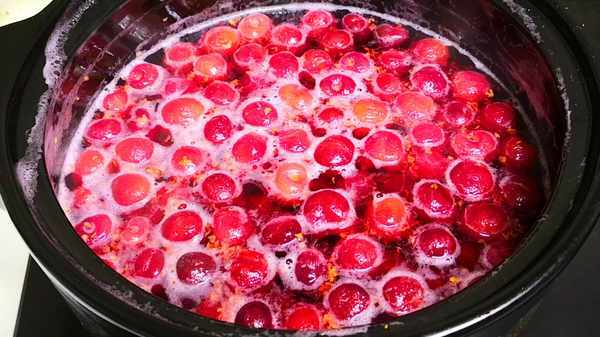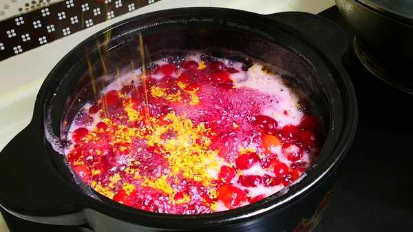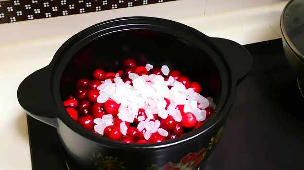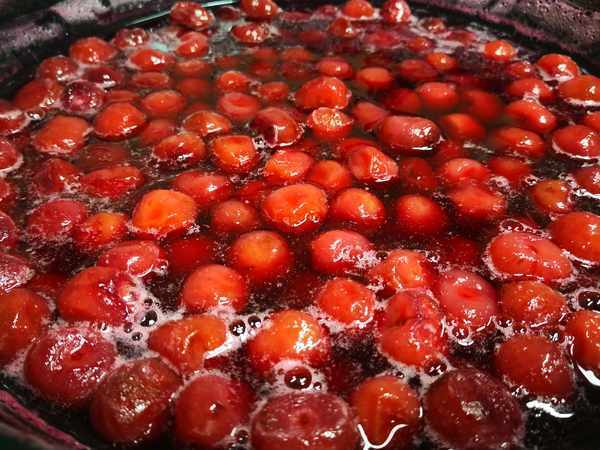 清洗幹凈後把大櫻桃放入砂鍋中,按照1:1的比例加入清水,再按照10斤櫻桃大約600克冰糖加入冰糖,開大火加熱,燒開後擠入半個檸檬汁,加入檸檬一個是增加口感、做好後香甜好吃卻不膩,另外可以延長保存期。繼續煮10分鐘後撒上一把桂花,攪拌均勻後關火,讓其自然晾涼。