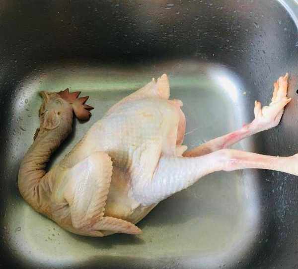 第1步、土雞收拾幹凈,用火燒凈浮毛。