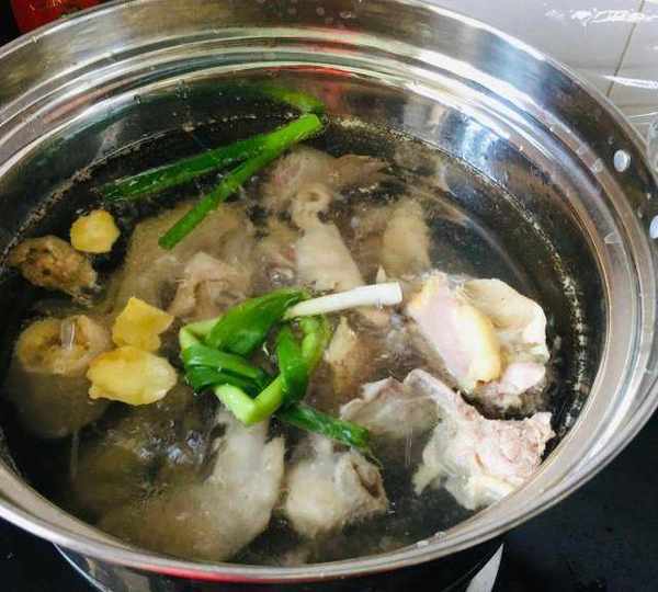 第5步、將撈出來的雞肉沖洗幹凈,放入另一口鍋中,加足開水,放薑片、蔥結。