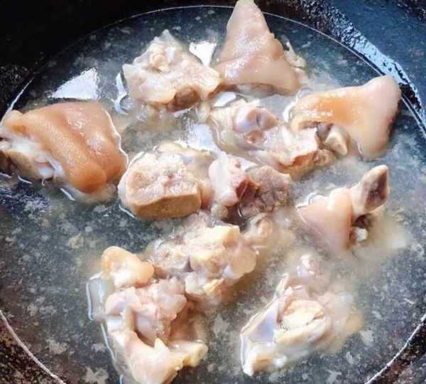 第2步、鍋中燒開水放入豬蹄焯水去除雜質和油脂,焯好水的豬蹄立即放入冷水中沖洗幹凈瀝幹水份備。