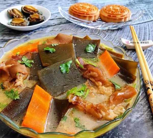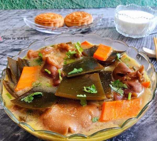 原料:豬蹄、海帶、胡蘿卜、薑、香菜、花椒、八角、料酒、糖、一品鮮醬油、蠔油、鹽、味精。