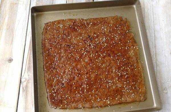 6.取出烤盤,如果肉烤出瞭油分、水分,就倒掉,晾一下後把肉片翻過來再塗上黑糖糖漿與芝麻,塗抹黑糖糖漿讓豬肉脯看有光澤,還碳烤的感覺,傢裡人愛這樣吃