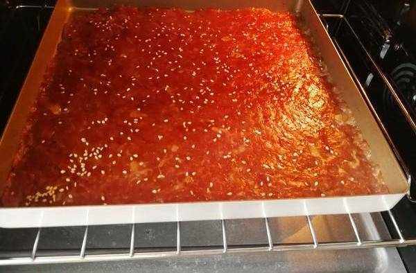 4.把冷藏好的肉末取出來,把它均勻地鋪在烤盤裡,用面粉棍搟至成為薄片,塗上黑糖糖漿