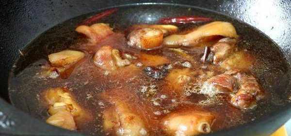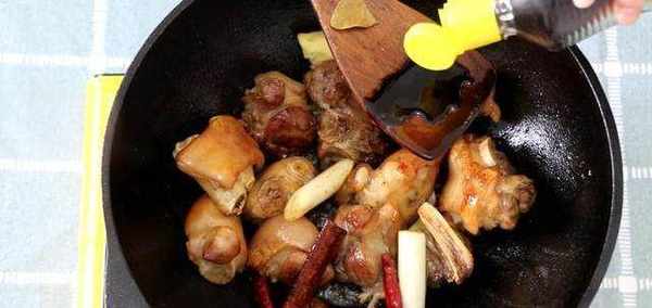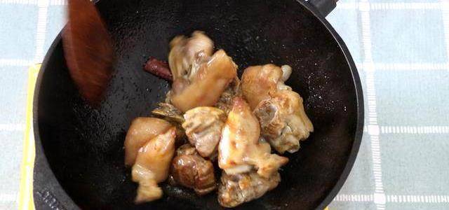 翻炒至豬蹄上糖色,加入蔥段、生薑片、香葉、辣椒繼續翻炒。