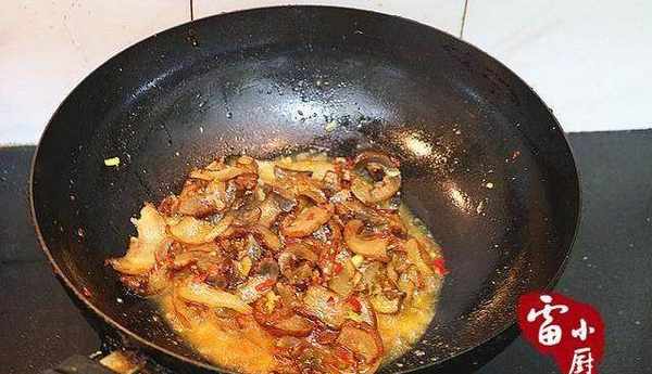 4、加兩勺剁椒醬一起翻炒均勻,再放少量的水燜煮至湯幹,讓臘豬臉充分入味。