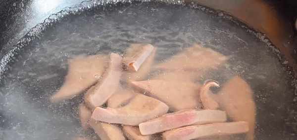 10.起鍋燒水,水開轉最小火,下入醃制好的豬肝,浸泡3分鐘。