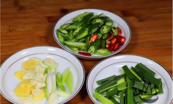 接下來我們要準備一塊生薑、一些大蒜切片,裝碗備用,準備一些大蒜葉切斷備用,最後再準備一些青椒,以及幾個小紅椒切片,裝入碗中備用。豬肝浸泡好以後,我們還要用手抓揉一下,愛你把豬肝烘幹水分。
