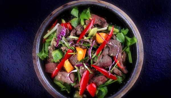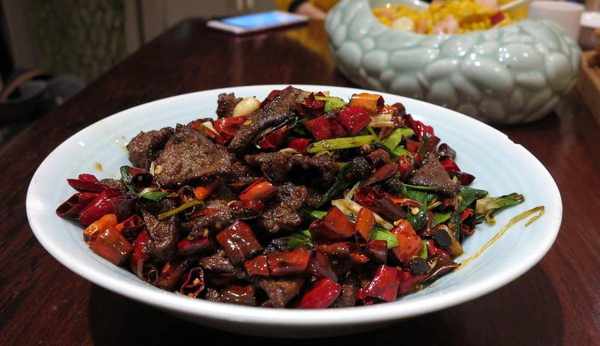7.待青椒炒熟後下入豬肝和調好的料汁,中火翻炒均勻,沿鍋邊倒入適量料酒繼續翻炒,待豬肝充分入味即可出鍋。一道鮮嫩爽口的青椒炒豬肝就制作完成瞭。