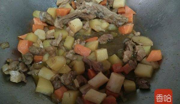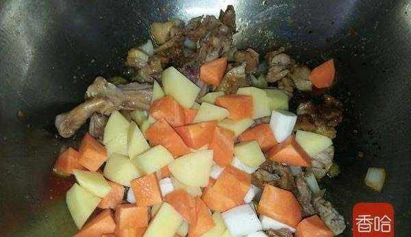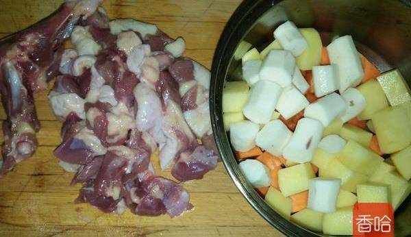 鴨腿一個、山藥一根、土豆一個、胡蘿卜半根、油兩勺、鹽一小勺、醬油兩勺、料酒一勺、五香粉三分之一小勺、洋蔥一小塊、薑兩片