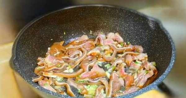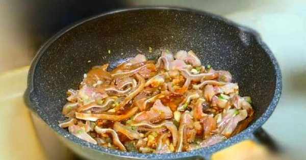 6.豬耳朵炒香後加適量生抽、鹽翻炒均勻。