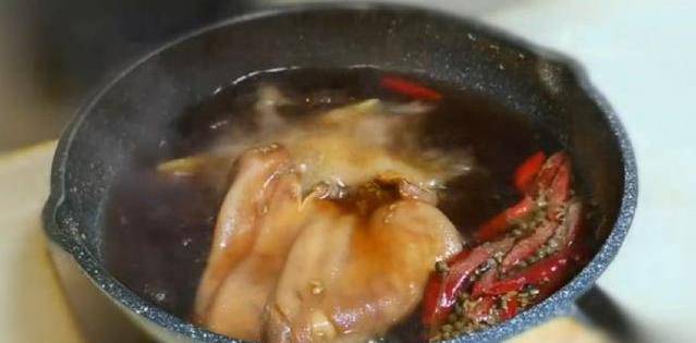 2.鍋中重新下入適量清水,放入洗幹凈的豬耳朵,加入幾片薑片、八角、桂皮、茴香、花椒和幹辣椒,再加一點老抽,蓋上蓋子大火燒開。