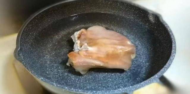 5.接著下入豬耳朵稍微煸炒一下,將水分炒幹。