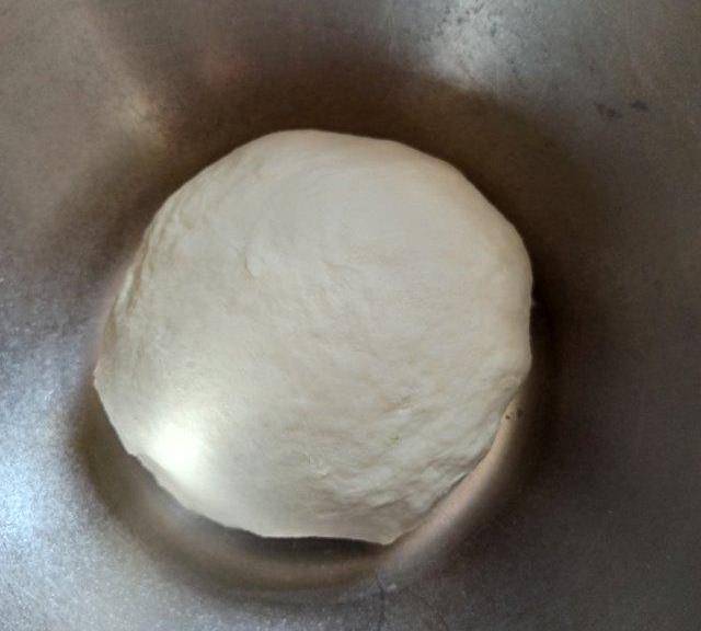 第8步、300克中筋面粉加入170克的水和成面團,和好後,先蓋保鮮膜醒面十分鐘,再將面團揉光滑,繼續省。我一般是在拌餡之前和面。