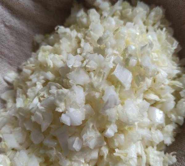 第5步、將擠水後的白菜先用一小勺熟油或香油拌一下(防止白菜後期出水過多)再與肉餡混合。