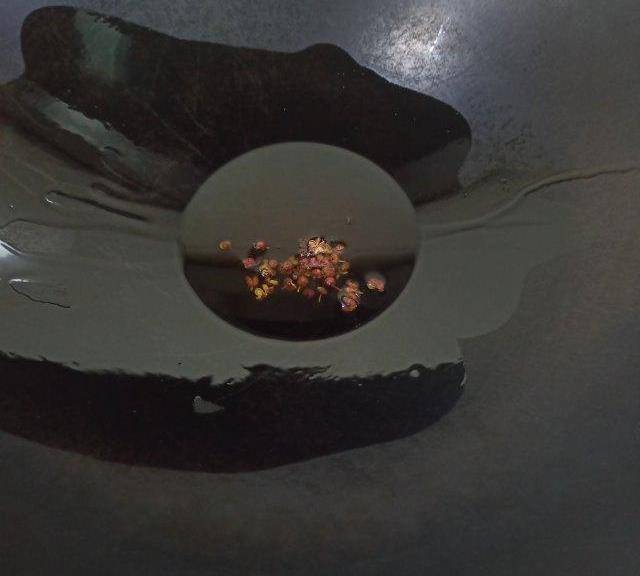 第4步、炒鍋加入稍多些油,小火炸香幾粒花椒,關火放涼備用。