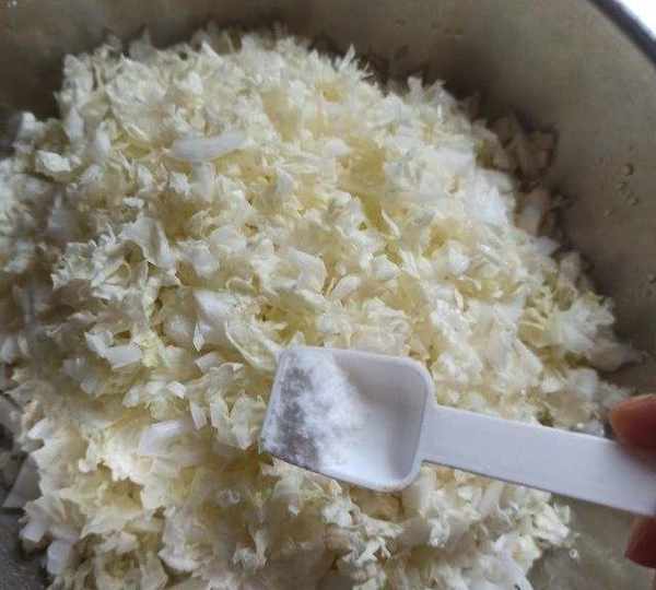 第2步、大白菜先切成細條,再剁成細碎的粒狀。不能剁的太碎,一定要有黃豆顆粒狀,這樣吃著有層次感。白菜餡中放入3g鹽拌均,醃10分鐘左右。