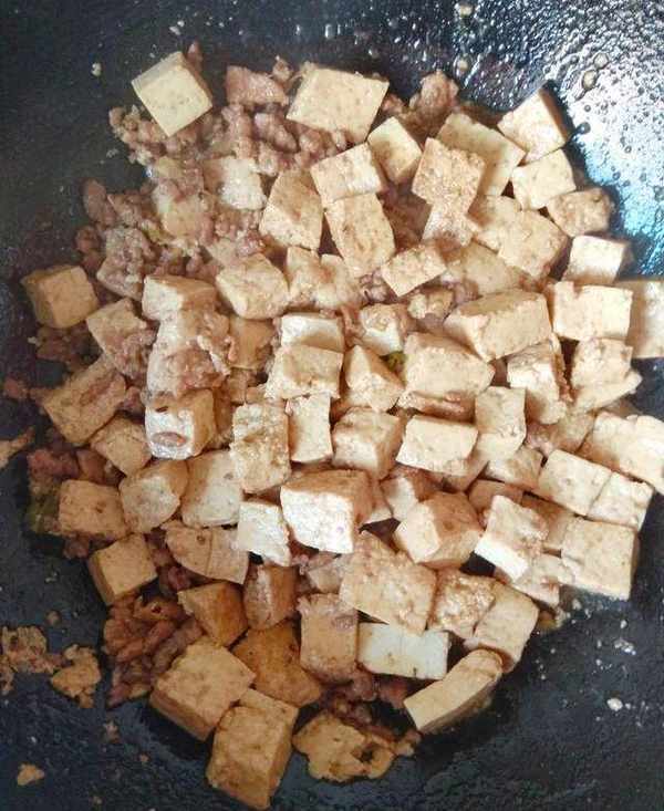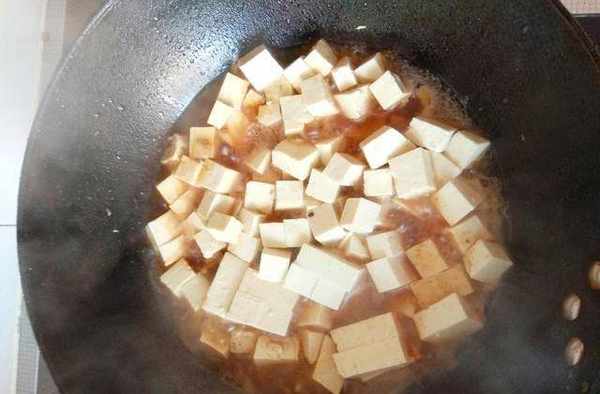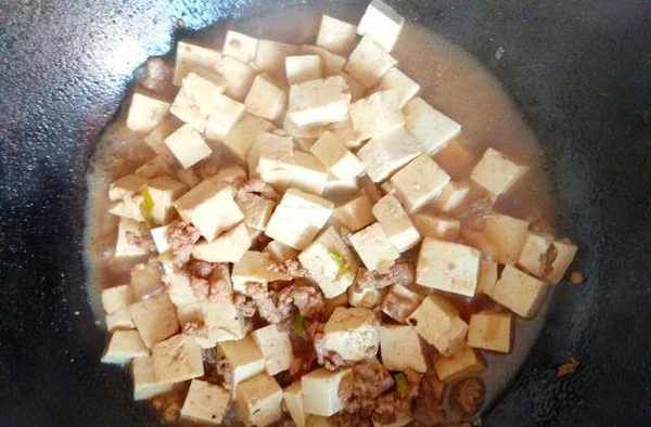 4.在肉末中加入一點鹽,料酒,適量生抽,入個底味。翻炒幾下加入適量水,有高湯更好瞭。下入切好的豆腐塊,據說豆腐塊焯一下水,可以去一下豆腥味,我不介意,所以沒焯水,可以根據你的情況來。