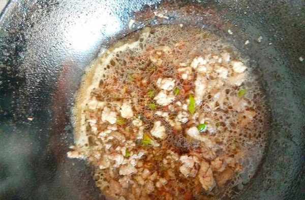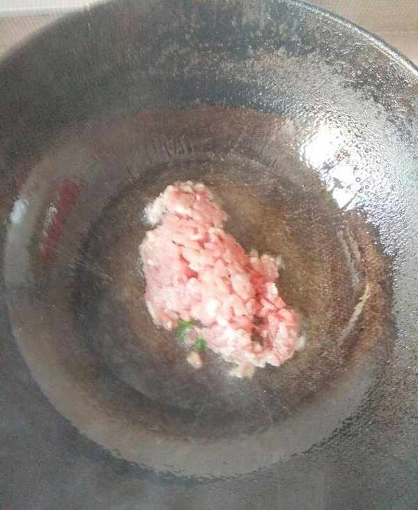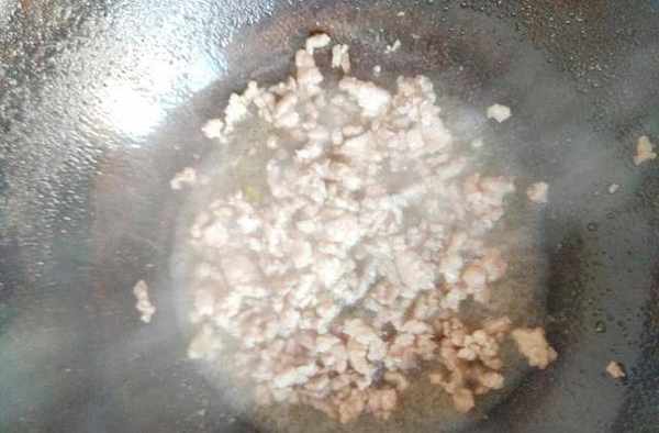 3.熱鍋涼油,油溫六成將肉末下鍋,劃散發白後,下入切好的蔥薑末,炒香。