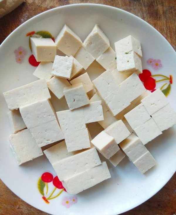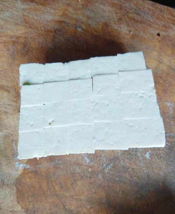 做法:1.將豆腐切成一厘米見方的一塊,如圖,要是看著不太齊,可以切之前修剪一下,我這塊豆腐原先就不太齊整,不妨礙吃