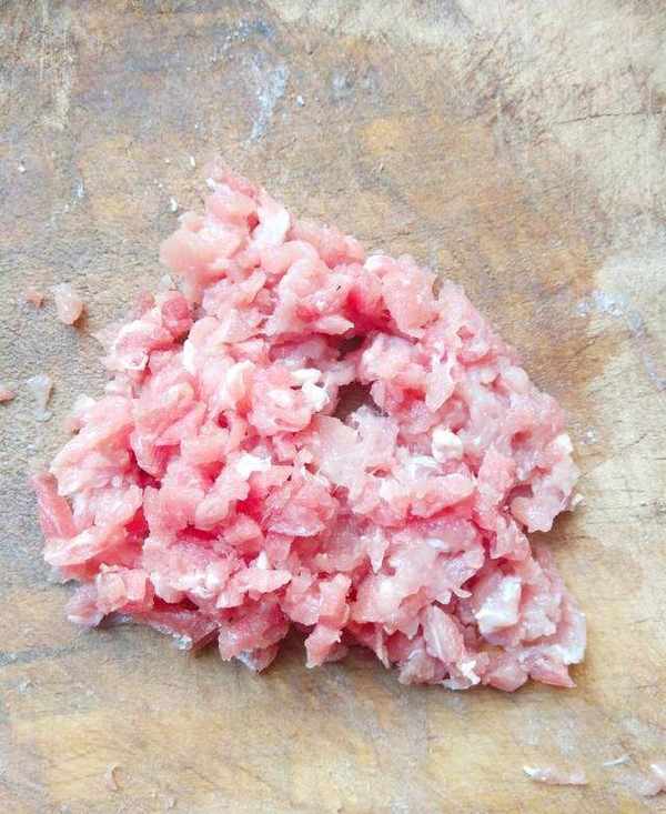 2.將豬裡脊肉先切片,再切細條,然後切末,剁碎。可以之前放到冰箱冷凍一下,切片容易。
