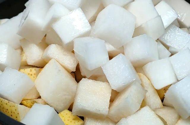 第一步:首先準備2個梨,清洗幹凈,再把它切成小塊(註意:梨皮是梨當中最具有化痰作用的,建議不要去皮),再準備一個白蘿卜清洗幹凈,去掉頭尾,同樣把蘿卜切成小塊,全部切好後,把它們放在一起備用。