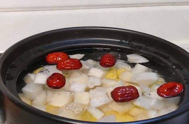第二步:砂鍋中加入足量的清水,開大火燒開後倒入切好的白蘿卜和梨,再加入幾顆紅棗,根據自己的口味加入適量的紅糖,如果傢裡有陳皮的話,可以加一點效果會更好(我做的時候沒有加,上次用完瞭),稍微攪拌一下,蓋上蓋子大火煮開後,轉小火煮30分鐘即可。