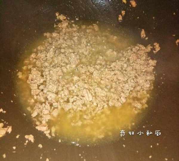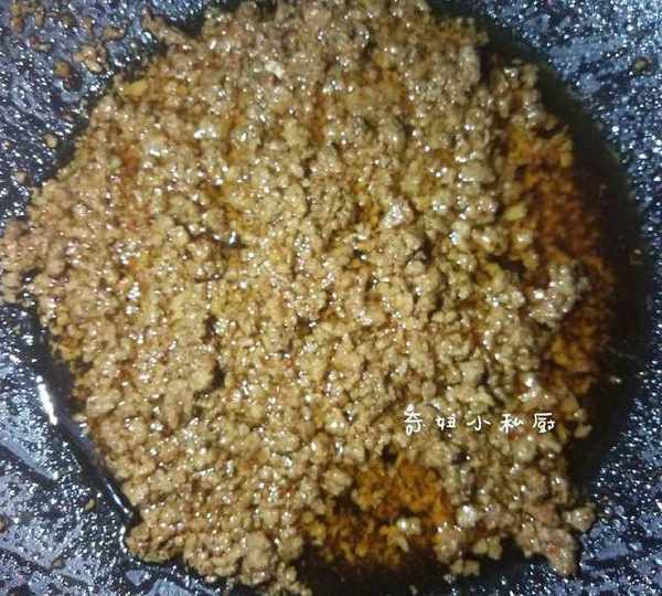 7.倒進牛肉肉糜,炒松散,都用小火就可以,然後加進少許鹽,適量生抽,少量雞精,讓肉臊有點味道就可以。