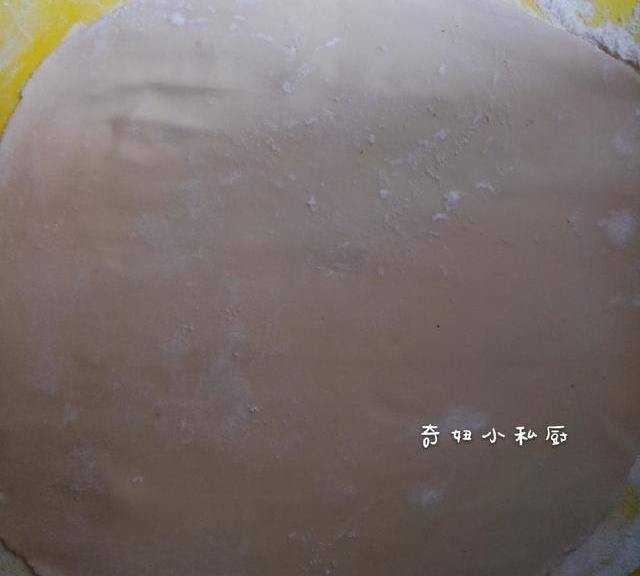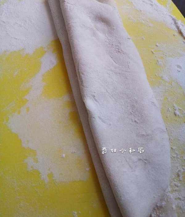 a.砧板上撒少許面粉,揪一小塊面團,揉圓,然後用搟面杖搟平,厚度根據個人喜好。