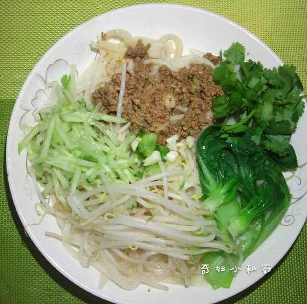 牛肉150克,面粉200克,蔥一根,香菜兩棵,青菜若幹,黃瓜一小節,細豆芽若幹。