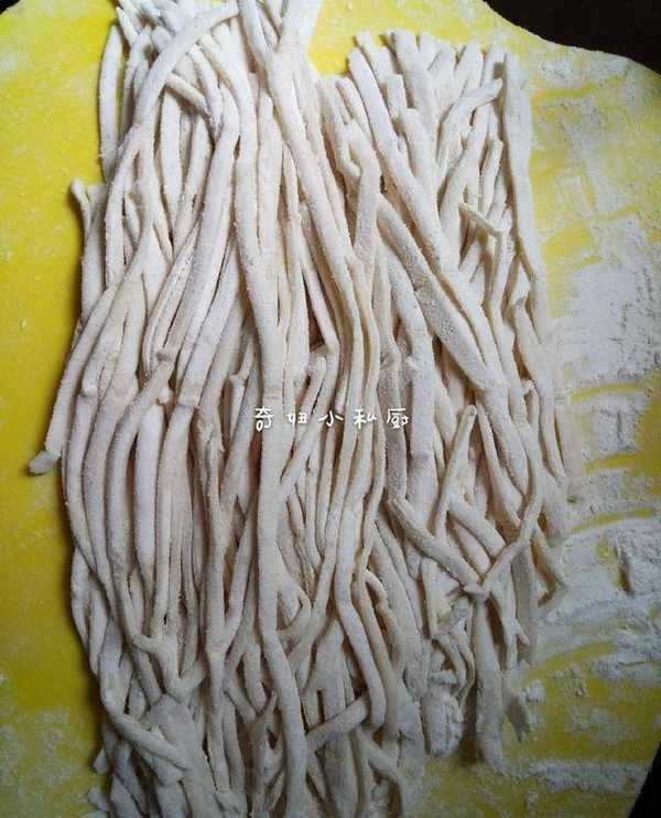 c.然後用刀切條,寬度根據喜好哈,抓住一端,抖一抖,面條就好瞭。