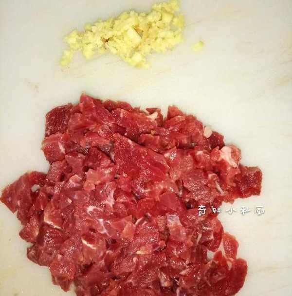 4.利用醒面時間,將牛肉洗幹凈切小塊,薑切末。