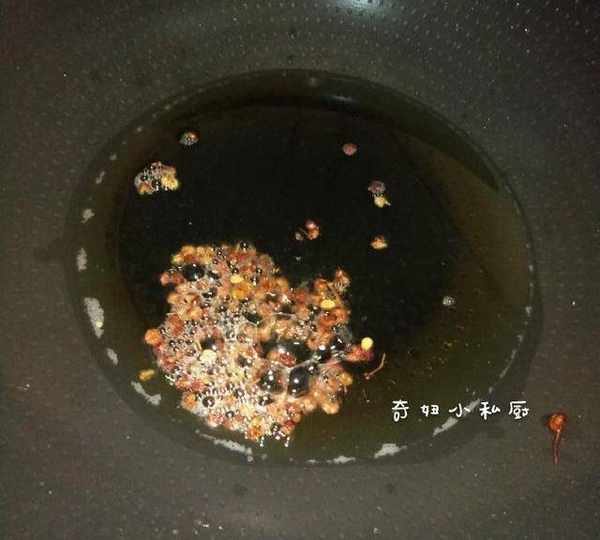 6.起鍋。鍋熱,加適量油,要多加些,油熱轉小火100c,放進花椒,爆香,撈出花椒。