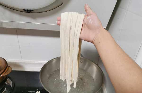 4. 拿出醒好的面團,搟成片,撒上幹面粉或玉米面,防止粘住,疊起來,開始切面,寬度隨意。切好後撒幹面粉,抖散面條擺好,準備下鍋。