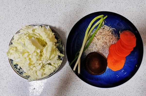 2. 處理配菜,蝦米沖洗備用,香菇胡蘿卜切片,白菜洗凈控幹水分備用,小蔥切末。