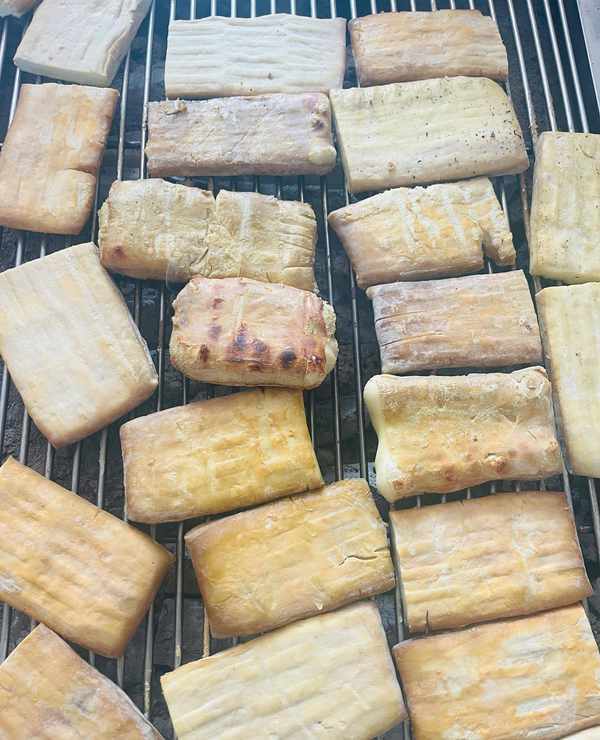 這就是雲南正宗的碳火烤豆腐,這一塊塊的豆腐,放置至微微有點臭豆腐的味道,就可以上到這燒烤架上,最後來到餐桌上瞭。