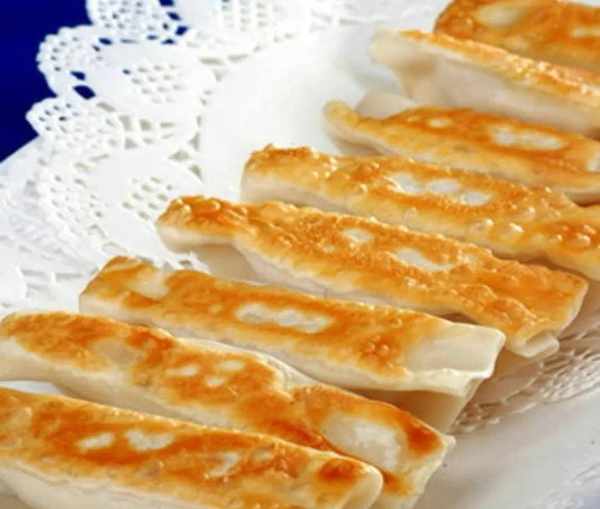 4.電餅鐺開啟刷上油,把包好的餃子排入鍋內,灑上水淋入香油,蓋上鍋蓋煎至底面呈金黃色時,用鏟子鏟出底面朝上擺入盤中即可上桌食用。