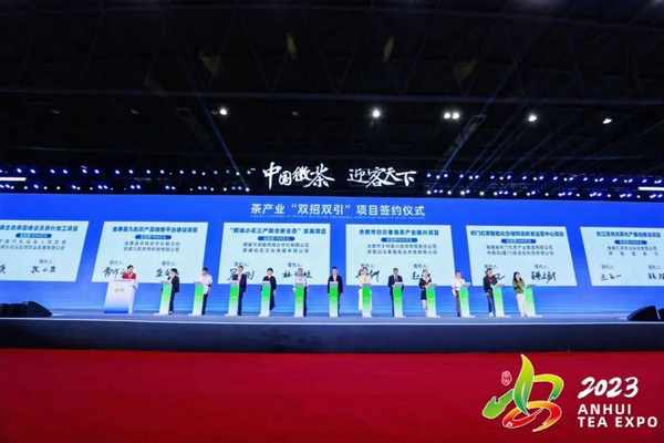 開幕式上,茶產業項目簽約儀式、2023長三角鬥茶大賽頒獎儀式依次進行,本屆茶博會簽約項目37個,總金額21.34億元,其中茶業戰略合作項目、黟縣青嶺山茶葉產業與文旅綜合體項目、霍山縣東西溪鄉農旅融合項目、池州市貴池區出口茶生產基地項目等12個重大項目在開幕式現場集中簽約。