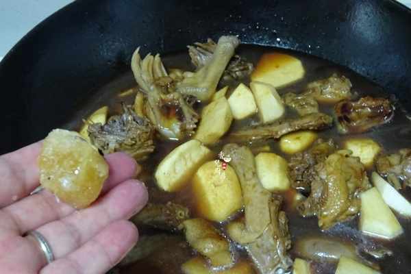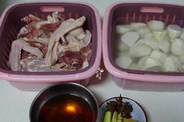 下麵分享詳細做法;需要的食材,鴨子900克、芋艿500克、調料;鹽3克、生抽醬油3湯勺、醬油1湯勺、黃酒3湯勺、生薑,小葱適量,冰糖10克、八角3顆。