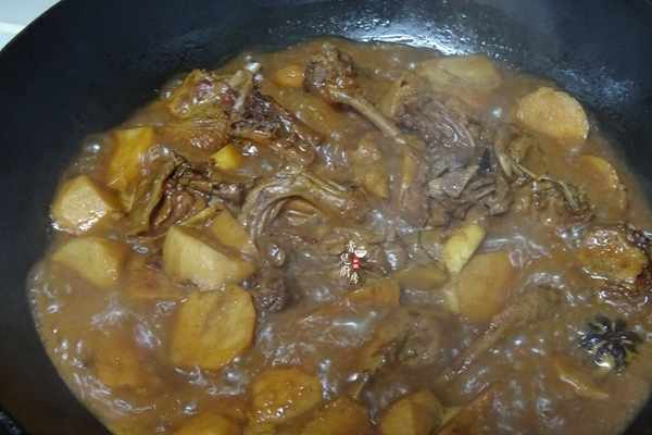 7.之後開蓋用大火燒,嘗試一下味道再加鹽調味,開蓋大火收汁,時不時的要翻炒一下。